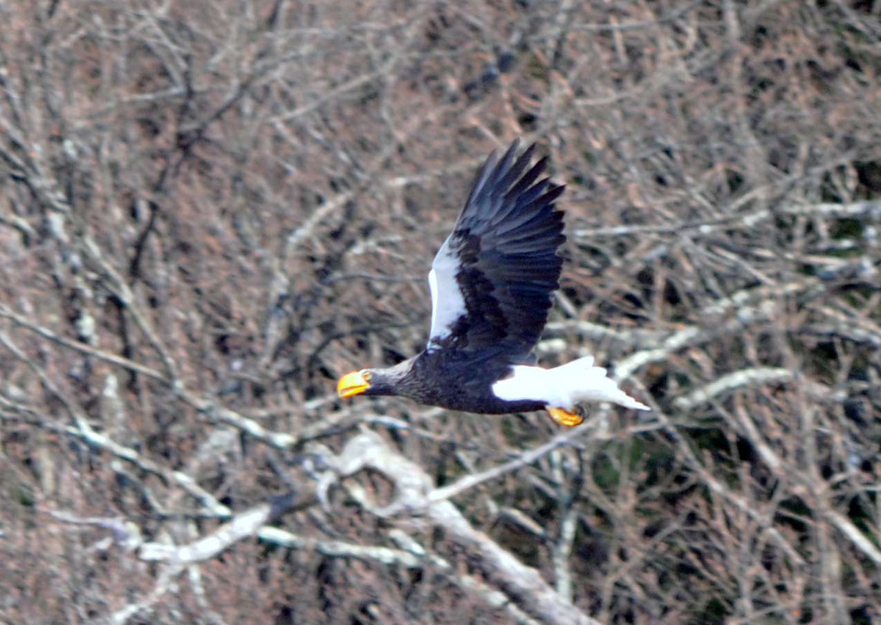 琵琶湖湖畔の山本山のオオワシ(Haliaeetus pelagicus 英:Steller's sea eagle)。今日も元気に舞っていました。鳥撮りカメラマン約100人。オオワシの棲む斜面に、ノスリ、オオタカ、ハヤブサも舞ってくれました。彼