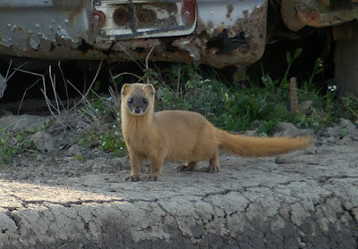 滋賀県の湖東の近江八幡市・西の湖のヨシ焼きが例年よりも約1週間遅れて行われた。良質のヨシを育てるために毎年春に行われるヨシ焼きでヨシ原の環境が守られ、結果としてそこに棲むいきものの生息環境が維持されてきた。ヨシ焼きが行われるとカラスやトビやアオサギが周辺より集まって来る。ヨシ原から逃げ出す小動物や逃げ遅れて命を落としたものが目当てである。またトビは煙浴のような行動も行う。今日は、ヨシ原から逃げ出たイタチと遭遇。あぜ道をどんどんこちらの方に走ってきたかと思うとぴたりと立ち止まった。気にしているのは僕の方ではなく、僕の後ろからやってきた散歩のイヌの様だ。イヌもイタチを見つけ吠えた、するとイタチの表情が一変し、、、つまりそれまでゆるく円弧をしていたシッポが真っ直ぐにピント伸びたからその緊張度がわかる。数秒、イヌの方を気にしていたが瞬時に草むらに飛び入った。Photo:2019/04/04 @北之庄沢、近江八幡市、滋賀県